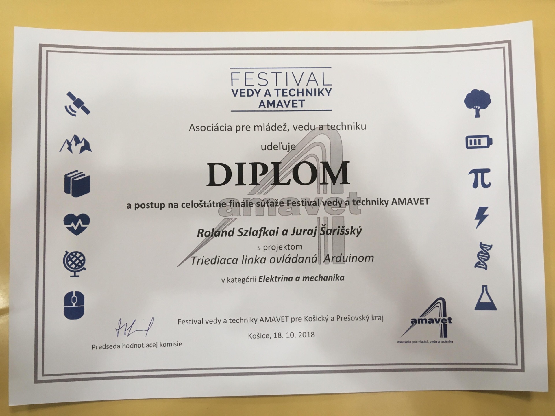 - práca Triediaca linka riadená Arduinom postúpila do celoslovenského kola Festivalu vedy a techniky v Bratislave