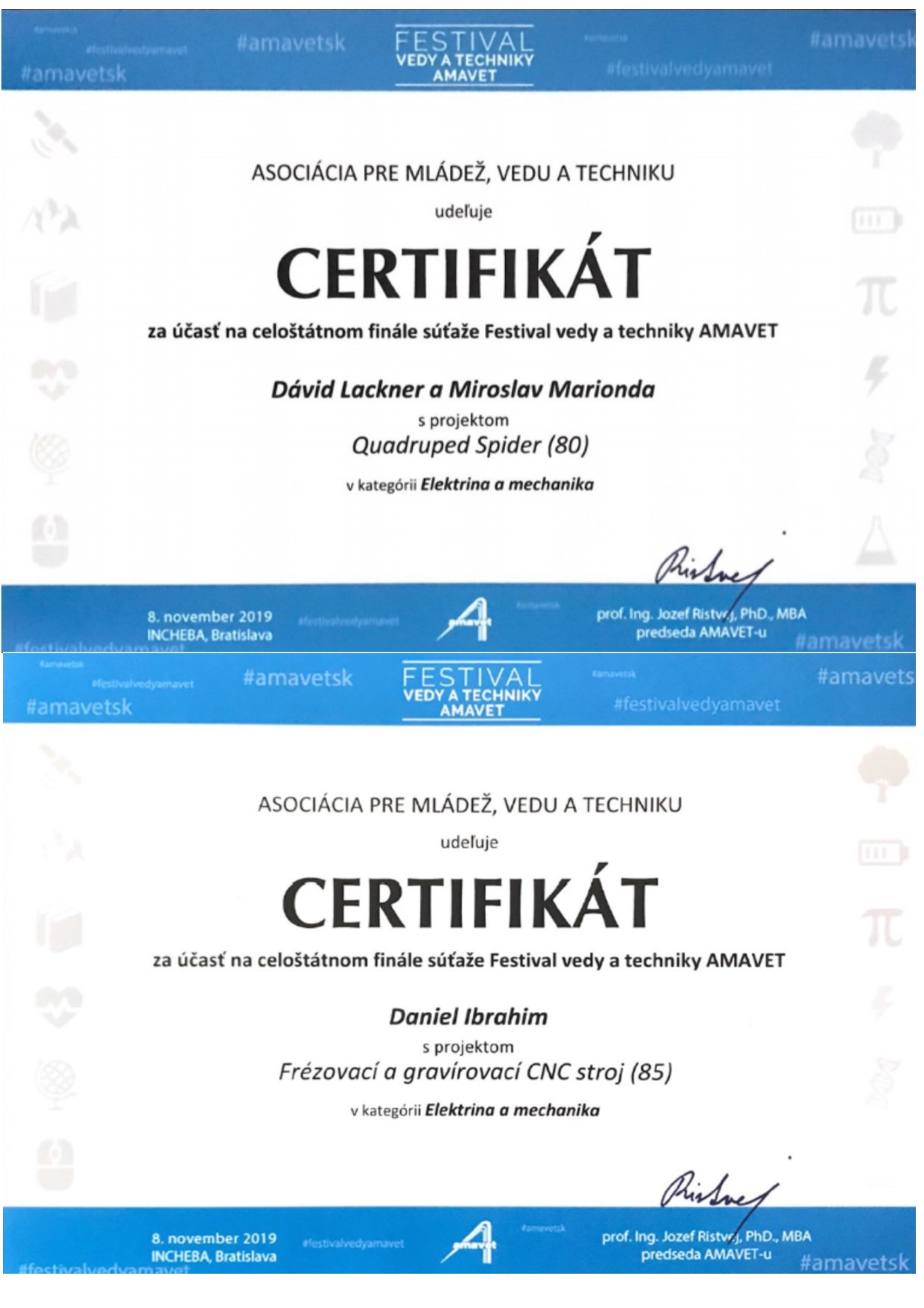 - účasť na krajskom kole Festivalu vedy a techniky s prácami: Frézovací a gravírovací CNC stroj a Quadruped Spider